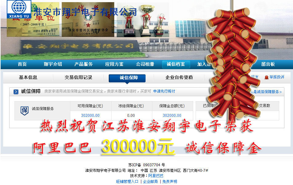 熱烈祝賀我公司江蘇淮安翔宇電子有限公司榮獲阿里巴巴誠信通300000元誠信保障金,感謝阿里巴巴公司以及工作人員對我們堅持誠信,堅持優(yōu)質優(yōu)價的認可與肯定, 我們將一如既往堅持誠信,做好產品,做好服務,來回報廣大消費者的厚愛與信任,并再次感謝阿里巴巴公司,誠信通電子商務平臺以及阿里巴巴工作人員努力。我們與阿里巴巴同樣執(zhí)著于電子商務的開拓與發(fā)展,堅信電子商務是現在也是未來商務的發(fā)展。